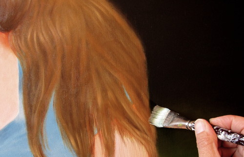 The hair is a bit dull, so a second pass is in order. To give it some life, I use a technique similar to painting fur. I apply a thin coat of gel to the canvas, making sure to extend out from the edge of the hair so when I start painting, I can flick my brush out and simulate the look of individual strands on the ends of the hair.